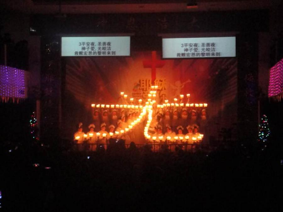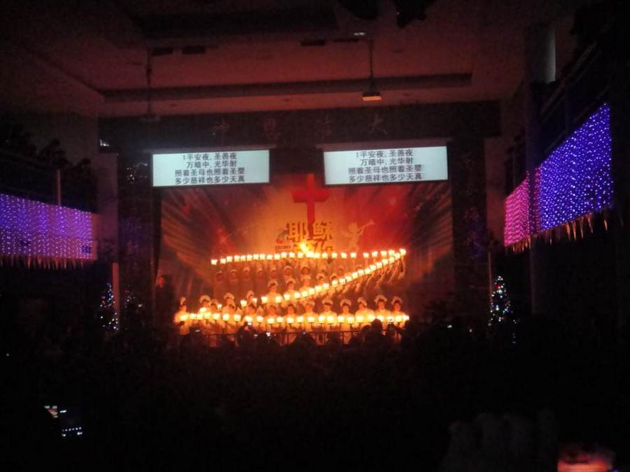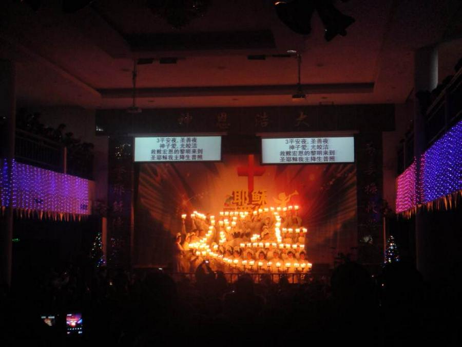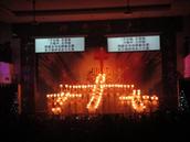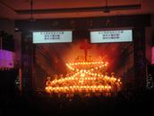 当所有的灯光都已经消失的时候,圣台上亮起了一串烛光,弟兄姊妹们身着象征基督之圣洁的白色服装,手托白色蜡烛,排出一个又一个造型。