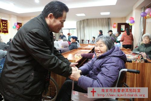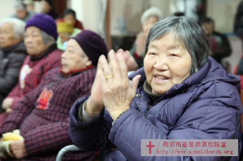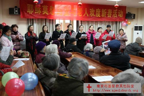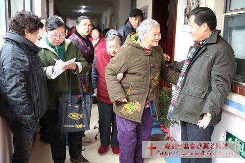 2014年1月27日上午九点,莫愁路堂李兰成主任牧师、李光明副主任、王兆南传道、樊蕾牧师、成琴姊妹、王桂林弟兄、李成友弟兄、陈腊英姊妹、程道霞姊妹及诗班十位弟兄姊妹,与江苏省爱心公益基金的谢晓玄姊妹同去秦淮区罗廊巷养老院探望老人们。给老人们带去爱心的关怀和新年的礼物:每位老人一双棉拖鞋、一个暖手筒。诗班的弟兄姊妹献上歌曲和舞蹈,大家提前给老人们拜年,祝老人们在新的一年中健康长寿、喜乐满怀!