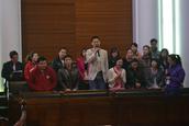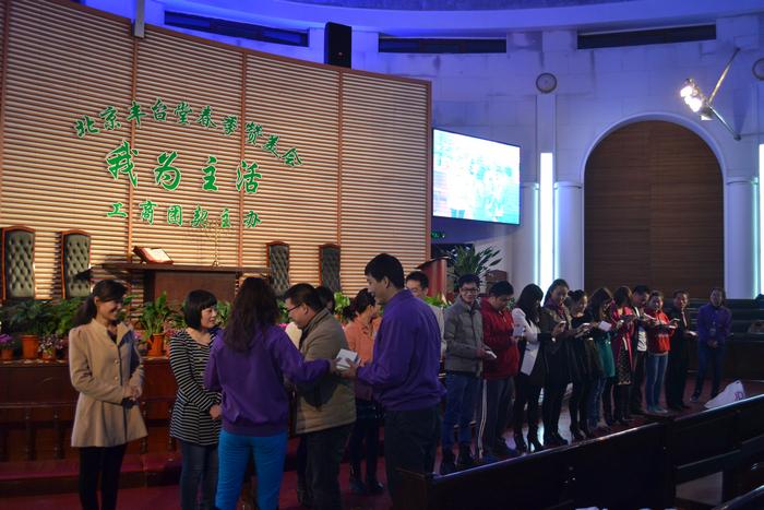 “诗班左面为摩西组,右面为亚伦组。”2014年3月21日,北京市基督教丰台堂青年团契举办圣经经句对抗赛,信徒与侍奉人员共31人参加。