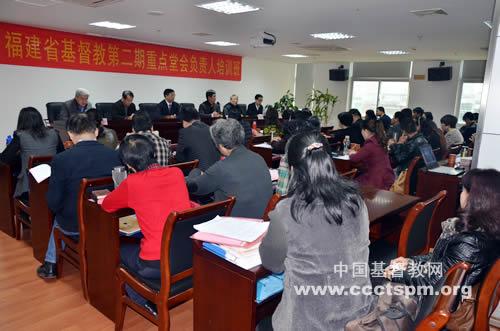 2014年3月25日至26日,福建省基督教两会第二期堂会负责人培训班在福州建闽大厦举办,来自全省34个重点堂会的37位负责人参加了为期两天的培训。培训班邀请了国家宗教事务局外事司薛春梅处长、福建师大鄢龙珠教授和我省基督教两会主要负责人岳清华主席和陈立福会长担任讲员,开设了《宗教外事工作》、《教会的领导力准则》、《基层教会与神学教育》、《管理学运用与实践》等课程。