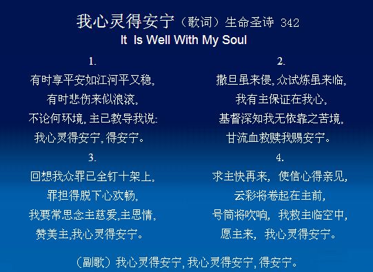 我们难以想象,就是在那样的情况下,这位刚刚失去4个女儿的男人,甚至是在妻子的哭泣声中写下了这样的句子:“有时享平安如江河平又稳,有时悲伤来似浪滚,不论何环境,主已教导我说:我心灵得安宁,得安宁……”