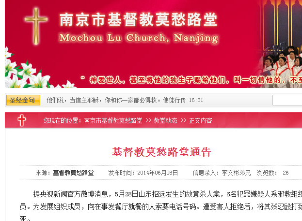 自山东招远“全能神”杀人案后,为了预防异端邪教对正统教会的侵蚀,南京市基督教莫愁路堂于6月6日通过网站发布通告,提醒教会会众提高警惕,增强安全意识。