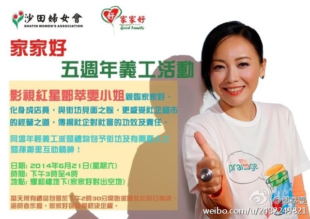 邓萃雯参加的是香港“家家好”小型超市的五周年活动,她作为一名义务店员,给有需要的朋友送上食品礼物包。邓萃雯在微博上透露,她参与这一活动的目的在于,“传扬社会企业参与社区的重要责任”,并“体验一班基层员工的工作及生活”。