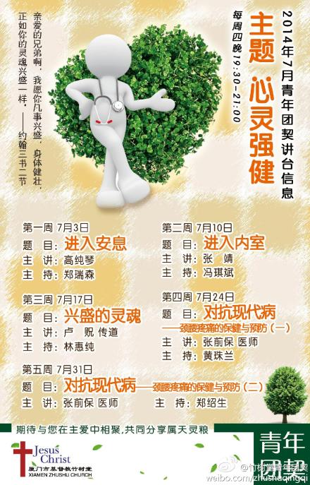 自重建至今已20余年的厦门基督教竹树堂青年团契,一直致力于弟兄姐妹的属灵成长,不时开展灵修、祷告、康乐会等活动,提供彼此交流和成长的平台。2014年6月28日,为方便弟兄姐妹了解7月份讲台信息安排,竹树堂青年团契微博特发布图片已告知。