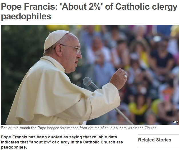 在接受意大利某报纸采访中,教皇说,2%性侵丑闻代表了全球414000神职人员中的8000人。那些娈童癖者中约有2%是神父、主教和红衣主教。
