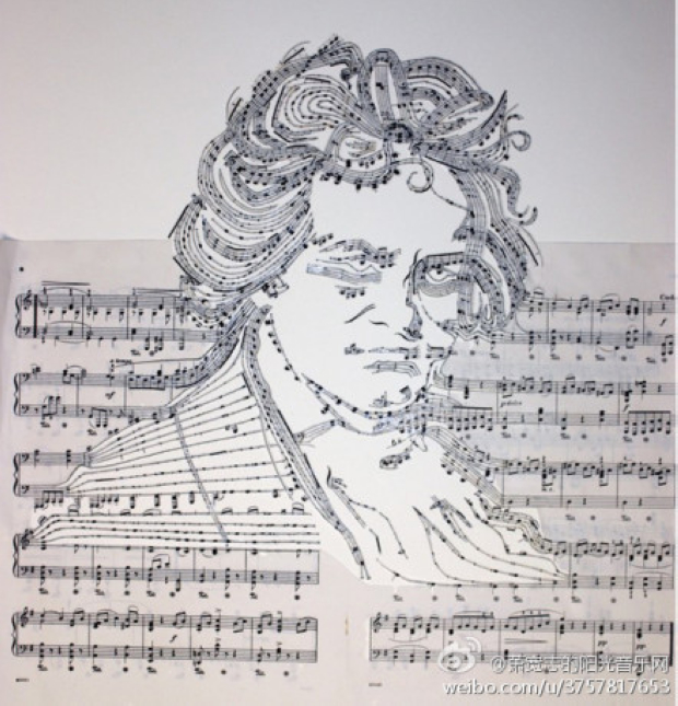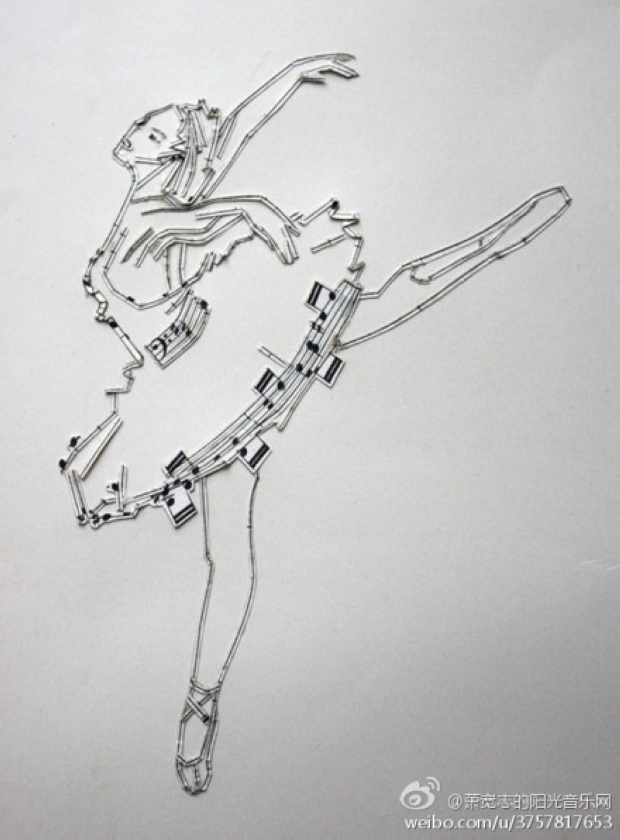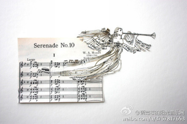 在组图中,艺术家用五线谱呈现出了芭蕾舞女演员、贝多芬、吹着乐器的天使等形状。据该微博介绍,“艺术家Erika Iris喜欢将一些旧的物件重新拆卸并不加任何材料的再创造,尤其是针对音乐和电影的相关材料。这次她拆的不是磁带,而是将乐谱重新裁剪并拼贴,让原先看似平淡的五线谱变的张力十足,富有激情。”
