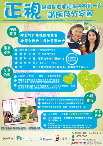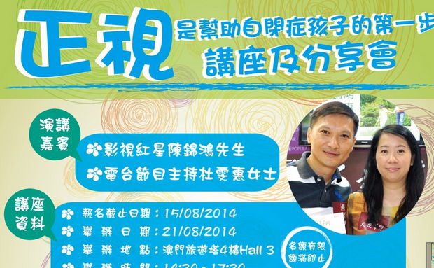 “八月二十一日,我们会到澳门出席一个自闭症家长分享会及讲座,有兴趣的朋友现在可以报名了!详情可参考这张海报,谢谢!”7月29日,台湾电台节目主持人,基督徒艺人杜雯惠在新浪微博发布该消息。 据海报介绍,他们夫妻二人的分享于8月21日下午14;30到17:30在澳门旅游塔4楼Hall3举行,报名时间截止到8月15日。