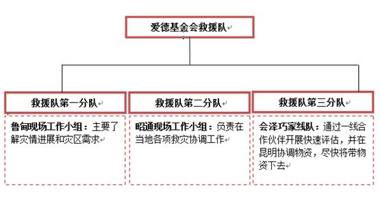 2014/08/04 02:52爱德基金会救援队第一分队到达鲁甸县城,紧急联络通往受灾乡镇;第二分队向昭通进发,负责在当地各项救灾协调工作