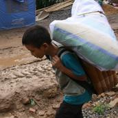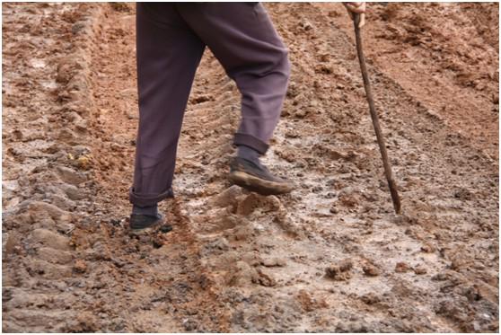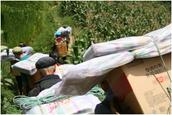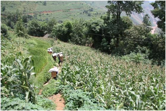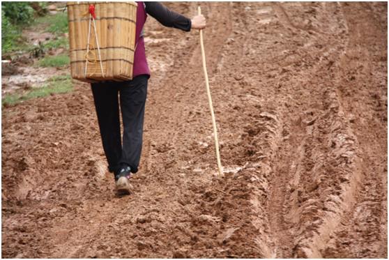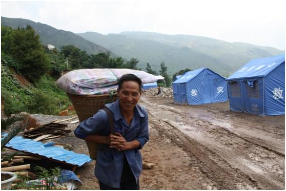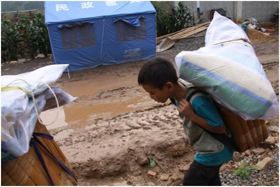 一位领到物资的船边社村民开心的规划着用防雨布搭建一个防雨棚,用油炸土豆给孙子吃。物资发放完毕后,船边社上至七十多岁的爷爷,下至十岁的孩子全部背起装满物资的背篓,再次踏上泥泞的回家之路。五公里的距离,对于平路来说已是一段不近的行程,莫说是山路、莫说还如此的泥泞。但这条路对于船边社的村民来说却是无法替代的,不仅因为它是一条承载着船边社与外界一切来往的通道,更因为这是一条联接着爱德救援队和受灾群众的路、一条联接着急需的物资和等待的家人的路、一条回家的路。