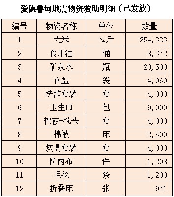 鲁甸地震发生以来,截止8月20日晚18时,爱德基金会共向灾区群众发放了以下救援物资: