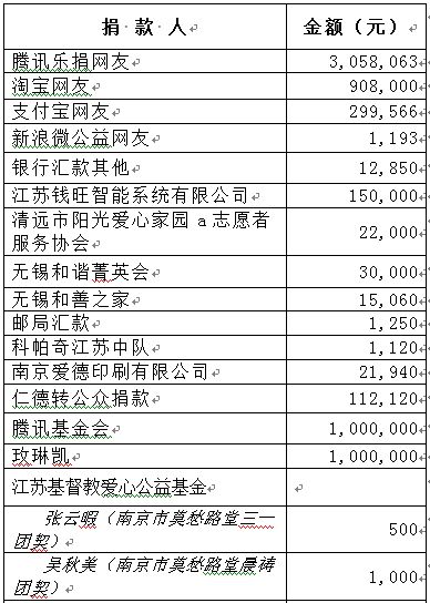 截止到8月20日18:00,爱德基金会共收到“鲁甸地震救援”海内外捐款总计约12,059,650元人民币, 明细如下: