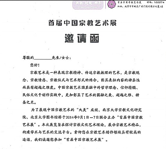 首届中国宗教艺术展将于9月1日至7日在北京大学图书馆举行。本次展览主题将包括“圆融之美—佛道教书画艺术”、“超越之维—基督宗教书画艺术”、“神圣之光—伊斯兰教书画艺术”。