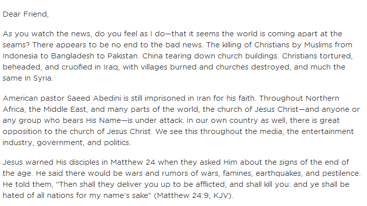 “当你看新闻的时候,你是否和我有一样的感受:好像末世快要到了?似乎没有任何迹象表明坏消息会终止。从印度尼西亚到孟加拉再到巴基斯坦的基督徒都被穆斯林杀害;中国教堂建筑被拆毁。伊拉克基督徒受到折磨、被斩首、钉死在十字架上,村庄被烧毁和教堂被毁,叙利亚情况大致相同。”这位牧师在公开信的开头写道。