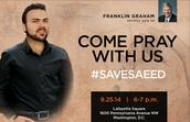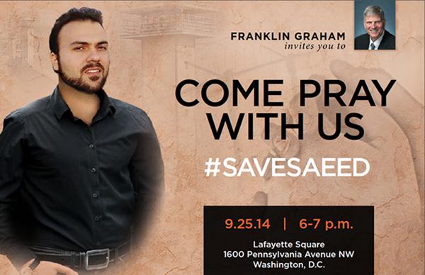 到9月25日,葛培理布道团葛福临牧师将会在华盛顿特区举办一个特备的祷告会,就在白宫外面的拉菲特广场,以帮助启动第二天世界范围内的祷告——会为赛义德牧师及其他被囚禁的基督徒坚固在基督里的信心而祷告。