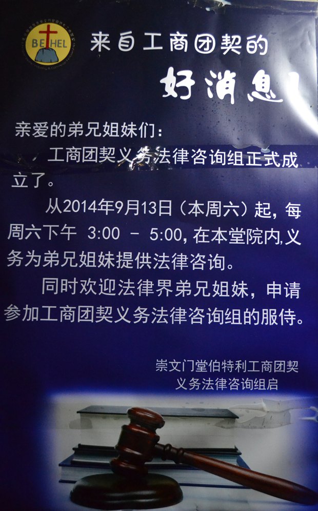 这则好消息以海报的形式张贴在崇文门堂院内的墙上,海报上显示,法律咨询组在9月13日已经成立了。该小组还邀请法律界的弟兄姐妹一同参与到这个服侍中。