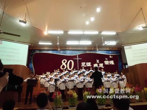 三一堂各圣乐团队(竹木琴乐队、主日学、青年诗班、以诺诗班、雅歌诗班、歌颂团)以及三一堂的保提、仁爱两个聚会点的赞美小组(圣乐组、圣舞组)分别登场献唱。在《让赞美飞扬》、《耶稣爱你》、《耶稣永不改变》、《你真伟大》、《安静》、《赞美主的爱》、《耶和华祝福满满》、《上帝儿女何等有福》等等赞美歌声中,将庆典活动推向高潮。三一堂八十周年庆典最后在苏牧师的祝福下落下帷幕。