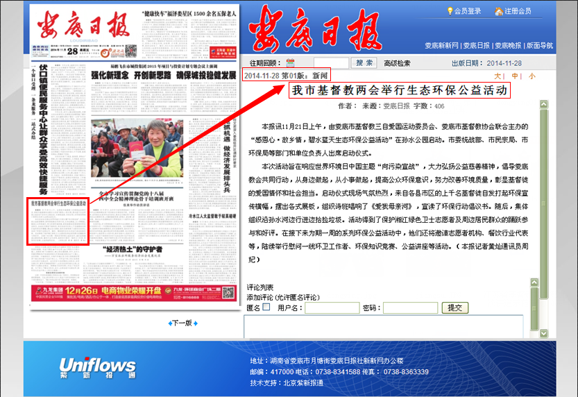 《娄底日报》2014年11月28日头版报道基督教消息:我市基督教两会举行生态环保公益活动