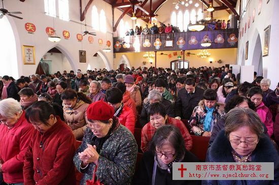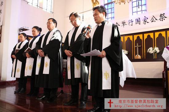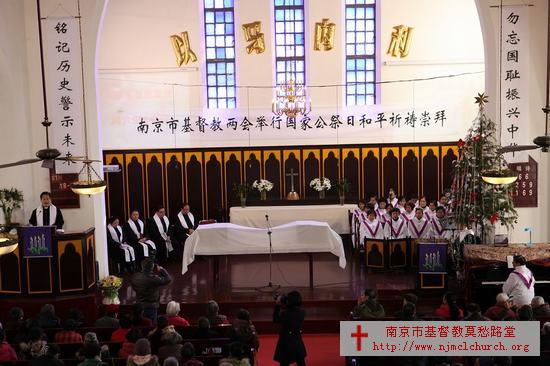 据莫愁路堂网站报道,莫愁路堂内圣台上方白底黑字的横幅写着“南京市基督教两会举行国家‘公祭日’和平祈祷崇拜”,圣台两边的柱子上也是白底黑字竖写着两幅:“勿忘国耻振兴中华”“铭记历史警示未来”。