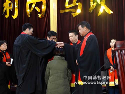主礼人任现民牧师向会众宣布今日礼拜之意义后,王复兴牧师宣读简历,举荐两位拟按立同工。任现民牧师带领宣誓问答。最后,四位牧师奉圣父、圣子、圣灵的名,分别为两位同工施行圣职按立礼。按立邵恩连同工(女)、王艳玲同工(女)为牧师。礼成之后,按立团为新牧师穿圣衣佩圣带,并颁发了《中国基督教教职人员证》、赠送了《圣经》。