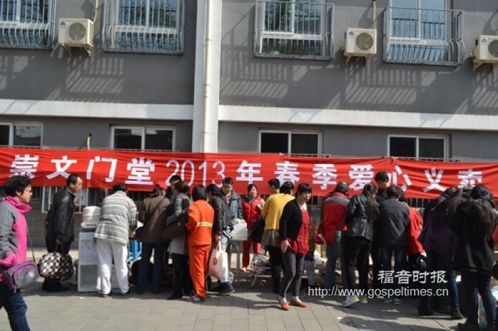北京基督教会崇文门堂每年春秋两季都会举办爱心义卖活动,发扬基督徒做光做盐的美好见证。每次开始之前,该堂都会用几个星期的时间来收集义卖物品,并在之后的4个主日举行4次义卖活动。义卖所得的收入将用于该堂的慈善事工。