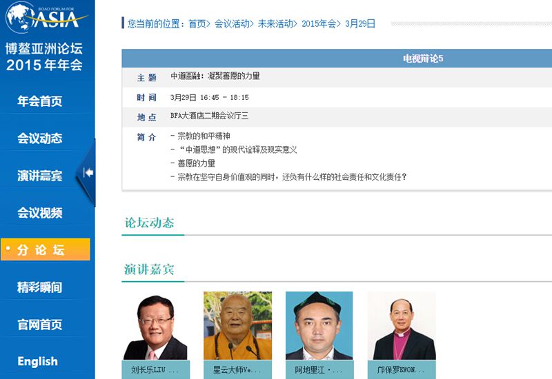 查看博鳌亚洲论坛官网可以发现,这个以宗教为主题的分论坛将会在2015年3月29日下午16:30-18:00举行,将由阳光媒体集团、阳光文化基金会主席杨澜主持,并邀请凤凰卫视董事局主席及行政总裁刘长乐、国际佛光会创会会长星云大师、中国伊斯兰教协会副会长阿地里江·阿吉克力木、香港圣公会大主教邝保罗4位嘉宾分别发表演讲。