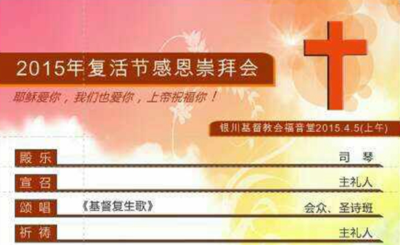2015年4月5日,为纪念耶稣基督的复活,宁夏回族自治区基督教银川福音堂(兴庆区湖滨东街153号)将举办复活节大型圣乐感恩崇拜。日前,该堂的圣乐服侍人员王爱崇姊妹向本站同工发来了赞美会海报及复活节期间该堂的活动安排。