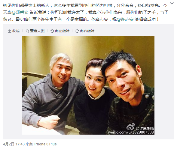 “初见你们都是突出的新人,这么多年我看到你们的努力打拼,分分合合,各自各发亮。今天当郑秀文告诉我说:你可以叫我许太了,我真心为你们高兴,愿你们执子之手,与子偕老。最少咱们两个许先生里有一个是幸福的。他名志安。……”4月2日香港造型师兼艺人许愿在微博中发言并附上了和两个人的合照。