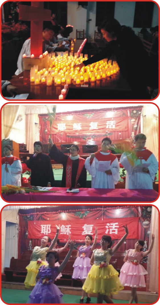 4月1日晚,中青年聚会,淀山湖教会特意安排观看录像“为万国祈祷”,拓展了弟兄姐妹祷告的范畴和境界,也体会神爱世人的心肠;4月3日晚,举行烛光崇拜,丁彩萍牧师主领,还有五位弟兄读经、五位姐妹辅礼,在默想和呼召中弟兄姐妹受感拿起圣台上心形里的烛光,随后全体跟着主领人绕堂一周,表明愿意传承使命的决心;4月5日6:00—7:40分举行复活节晨曦礼拜;4月5日复活节主日崇拜,闻牧师分享了生命的意义,他劝勉大家不仅要看重肉体的生命,更要看重灵性的生命,因肉体的生命终将过去,唯有信靠独一的真神,灵性的生命才得以永远的存活。当天下午,该教会举行复活节庆祝活动,弟兄姐妹献上了精心准备的歌曲、舞蹈、游戏等,充分体会耶稣的复活带给人类的喜乐和盼望。