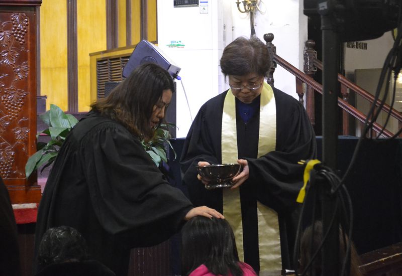 在每个问题都得到肯定回答后,李培英牧师说:“既然如此应许,我们现在遵照基督的吩咐、教会的差派与你们施洗。”
