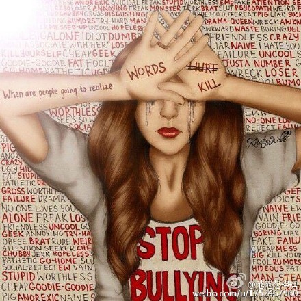 微博上,范玮琪配了一张因负面话语而流泪的女孩图片,女孩的衣服上写着“停止欺凌”的红色大字。女孩的背后,写着密密麻麻的负面语言:愚蠢的、猪、失败者、身份低贱的、没人爱、疯了……