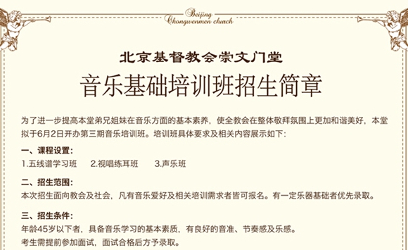 为提高弟兄姊妹在音乐方面的基本素养,提升教会的整体敬拜氛围,北京基督教崇文门堂拟于6月2日开办第三期音乐培训班。