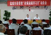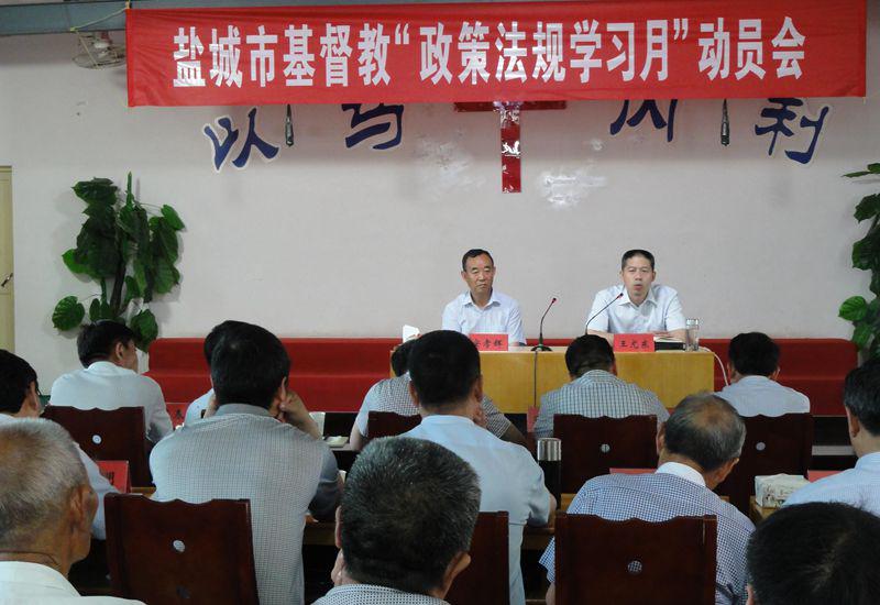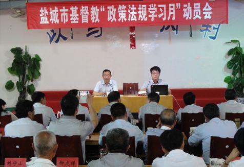 2015年6月10日,江苏省盐城市基督教两会在市基督教真道堂召开“宗教政策法规学习月”动员会。市两会本届全体堂委,全市各县(市、区)三自会秘书长以上人员,市基督教直属场所负责人参加了会议。