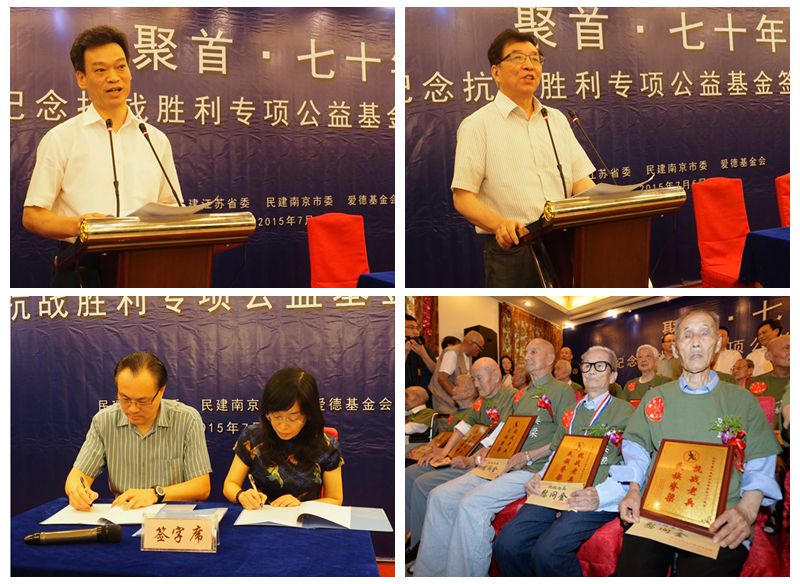该基金由民建江苏省委、民建南京市委和爱德基金会联合发起,旨在纪念中国人民抗日战争暨世界反法西斯战争胜利70周年,弘扬爱国主义精神,关爱曾经英勇保卫祖国的抗战老兵,支持南京民间抗日战争博物馆发展。民建江苏省委专职副主委郝星辰与爱德基金会资源发展总监李洋共同签署了合作备忘录。张修齐等33位来自全国各地的抗战老兵代表莅临现场并获颁荣誉奖牌和慰问金。
