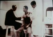 后来日军常来塔亭医院就诊。鬼子官兵染上花柳病的也是来塔亭医院就诊。一次一位被掳到汇丰银行里的妓女在银行洋房的地下防空洞里生孩子,该谁去接生?为保护医院里年轻女护士的安全,陈为信只好带着老年女助产士包罗以前去汇丰银行里接生。防空洞里的通道是马蹄型的,一片漆黑。陈为信说,走了大约25米长的通道才到,每一步踩在地上的声音就像踩在自已的心脏上。大家都很紧张,直到陈医生他们归来,大家才松了一口气。