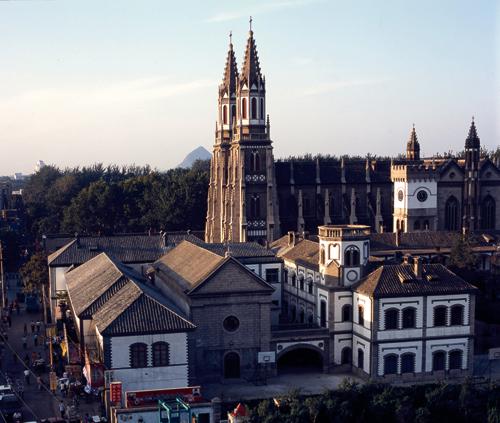 欧洲教士来济南(历城)传教始于明朝崇祯年间。清顺治七年(1650),天主教北京教区的西班牙教士嘉伯乐来到济南,在县城高都司巷将军庙街购地13.6亩,创建了一座从结构布局到外观造型均为西方教堂模式的天主堂,这也是济南近代建筑活动最早的纪录。同治九年(1870),天主教济南教区德国神父顾立爵,又在济南城东3公里处的洪家楼村购地兴建新教堂。当时教堂选址洪家楼是经过认真考察才定址的,因为那时的洪家楼南有苍翠的群山,北有广阔的水面,西为济南府城,东面是诸多相连的村庄,属平原地带,又靠近胶济铁路的黄台车站(当时叫济南东站),环境上佳,交通方便,人口集中,是传教的理想之地。