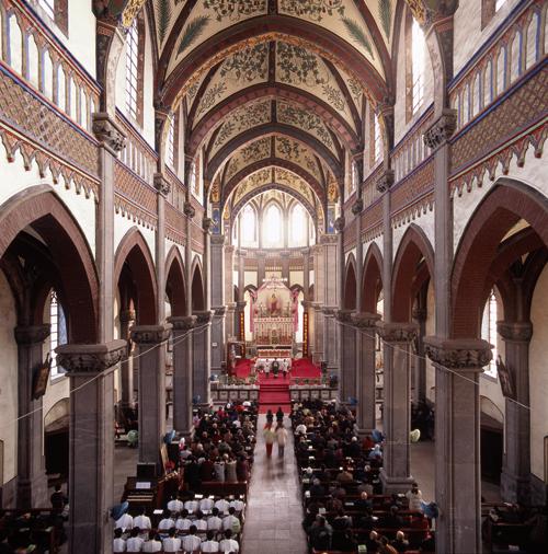 教堂大厅山墙上窗户紧密相连,底层的火焰门上刻满生动的雕像,一切都充满了向上的动势。教堂中厅为四层,中厅和两座钟楼塔正面分别有一个尖形拱门,中间主门略大,门上刻有浅浮雕花卉纹饰,两侧是精美砖雕门框。教堂内部则采用罗马拜占庭式教堂建筑风格,空间宏大,进深很长,给人一种历史的纵深感。内有两排方形大石立柱,柱头雕有镂空花卉,高耸的穹隆顶上满绘宗教壁画,耶稣受难等天主教题材的壁画和雕刻充斥周遭,使大厅充满神秘的宗教气氛。