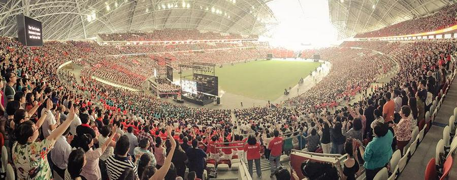 当地时间7月5日,新加坡体育场内,5.1万基督徒身穿红色T恤聚集。新加坡现任总理李显龙的出席,使得体育城内所有人挥舞国旗并欢呼庆贺。