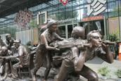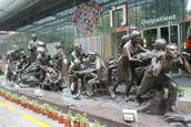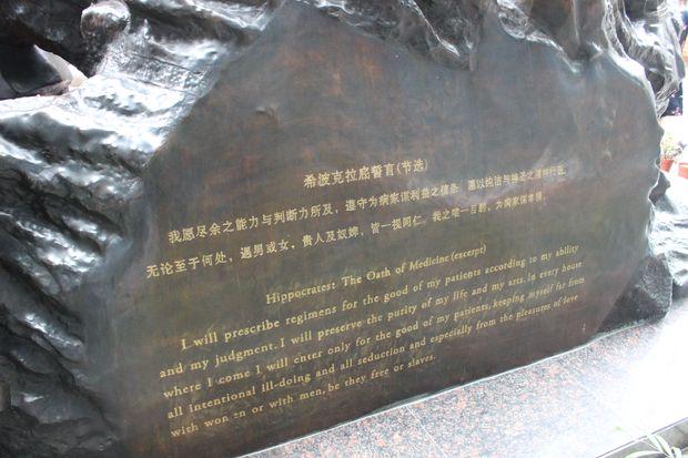 走到成都市第二人民医院门诊大厅前,首先映入眼帘的是一幅古铜色的大型群雕,有高鼻梁、长卷发、手持听诊器的外国妇女,也有用担架抬着病人的医生护士,这座浮雕名为《百年大爱》,凝聚着二院的精神文化。这所医院由加拿大传教士启尔德创办于1892年,起初名叫“福音医院”,后改名为“仁济医院”,它曾于抗战时期,本着“爱众人的心”的理念,积极救死扶伤。