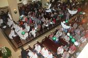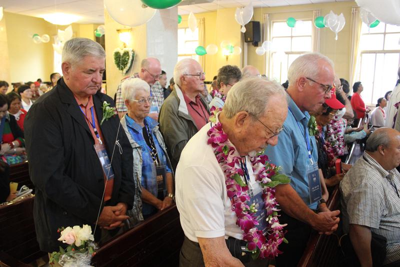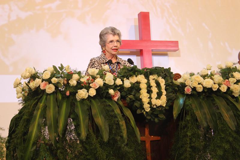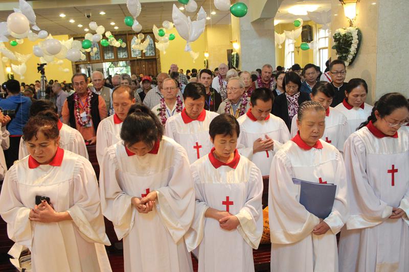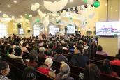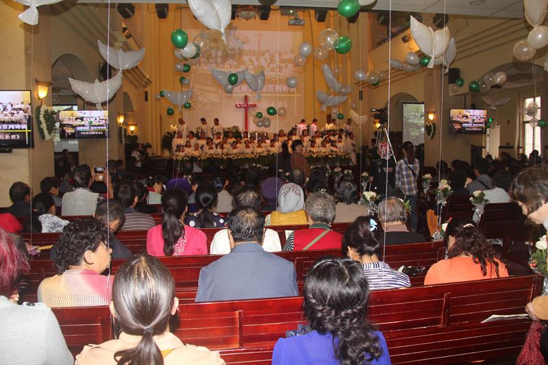 为了这次特殊的崇拜,三一堂装饰一新,教堂内漂浮着气球和象征和平的塑料白鸽;座椅的一侧则绑着粉色、黄色及白色的玫瑰,散发着馨香;圣讲台上,绿叶簇拥着鲜花,白色玫瑰拼出了“70”的字样。