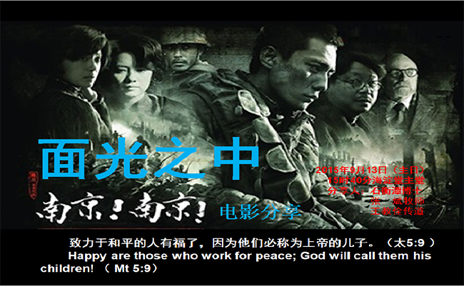 9月13日(周日)15:30,北京海淀堂将举办题为“面光之中——《南京!南京!》”的电影分享会。届时,中国社会科学院石衡潭博士将与海淀堂张斌副牧师、王教佺传道以座谈会及讨论的方式展开分享。