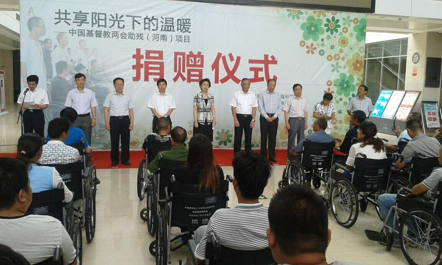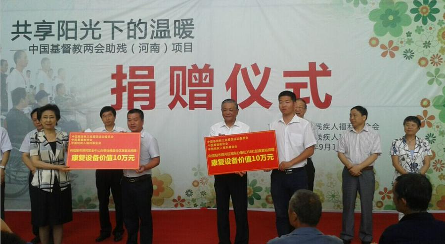 2015年9月10日上午,“共享阳光下的温暖”——中国基督教两会助残(河南)项目捐赠仪式在信阳市举行。中国残疾人福利基金理事会和中国基督教两会共向信阳市捐赠价值20万元的康复设备,并捐赠轮椅400辆。