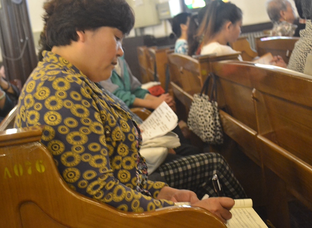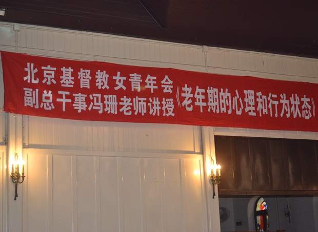 北京崇文门堂内拉着活动的横幅(图:福音时报)
