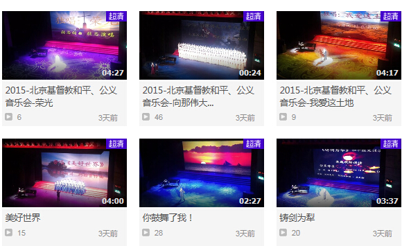 目前,网络上已可看到十余个节目的视频片段,包括诗歌《圣城颂》、《赞美大荣光》、《You Rasie Me Up》、《荣光》、《生命之源》、《美好世界》和由教堂琴师阎述诗所谱曲的革命歌曲《五月的鲜花》等。这些视频由现场观众录制和上传,音视频效果并不是最佳,据悉,后续将有现场光盘出炉。