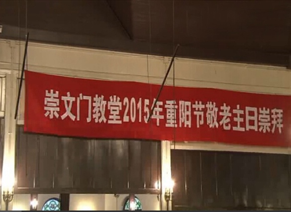 当天的主日崇拜上,崇文门教堂主堂内拉起一条横幅,其上写着“崇文门教堂2015年重阳节敬老主日崇拜”。此外,该堂孙丽华牧师和段金鑫教士还分别以《欢喜父母心》和《尊老有福》为题分享信息。其中孙丽华牧师指出,孝敬父母不仅是中国的传统,更是来自于神的教导,也是我们必须谨守遵行的诫命。