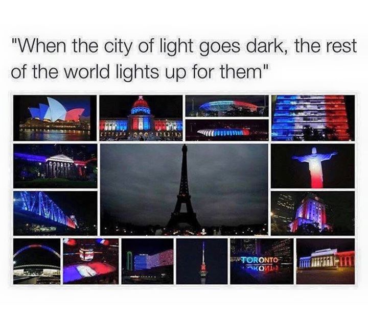 上周五晚上,法国巴黎,一连串的爆炸,129个无辜生命,纠结着全球人民的心。不过,恐怖主义并没有吓倒巴黎人民,更没有吓倒全球人民。巴黎民众和孩子们带着眼泪为遇难者哀悼、唱诗;全球民众则通过各种方式为难民祈祷。“当巴黎的灯熄灭的时候,全世界的灯都为她点亮。”