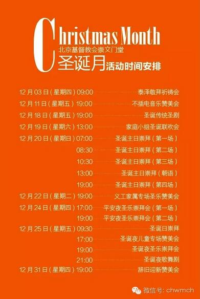 圣诞月活动的重点放在圣诞周,其中12月20日(周日)有4场圣诞主日崇拜,12月24日(周四)有2场平安夜圣乐崇拜会,12月25日(周五)有4场聚会(圣诞日崇拜、两场赞美会、一场歌舞剧)。