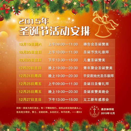 2015年圣诞节即将到来,福音时报将像往年一样,为读者收集全国各地教会圣诞节期间(包括平安夜)的活动安排,同时也希望弟兄姐妹们合理安排时间,到教会中与众肢体共同纪念耶稣基督的降生。以下是燕京神学院2015年平安夜圣诞节活动安排。