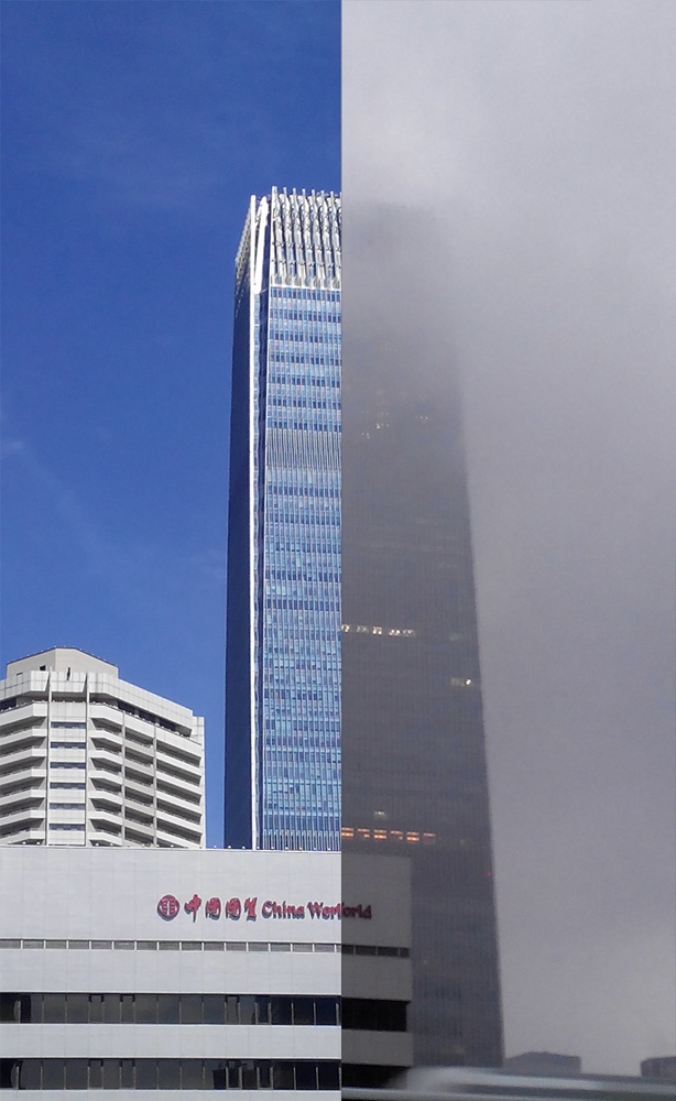 晴霾天气下的首都国贸(拼版照片)编者按:近日,北京再次遭遇重度雾霾天气。本站收到读者发来的一首相关诗歌,以及首都国贸晴霾前后对比照片,现刊登如下,希望藉此鼓励弟兄姊妹珍惜天父上帝赐下的蓝天白云,并为祖国的环境献上祈祷。