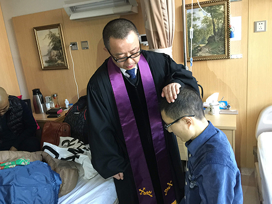 11月29日,北京崇文门堂杨建立牧师在病房里为肝癌晚期患者刘杨和他的父亲施洗,父子二人还一起领受圣餐。