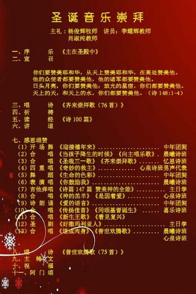 其中圣诞音乐崇拜将由四个诗班(心泉诗班、晨曦诗班、忆恩诗班、喜乐诗班)以及中年团契、儿童班献上舞蹈、表演唱、吉他弹唱、四声部合唱、诗朗诵、圣剧表演等12个节目;平安夜感恩崇拜则以青年团契精心排练的圣剧(耶稣诞生)拉开序幕的十个节目组成;而圣诞感恩崇拜将由该堂18个片、点中近100个小组的弟兄姊妹及祷告组准备的17个节目组成。据城南堂官网介绍,参与2015年平安夜圣诞节活动演出的总人次将逾千人。